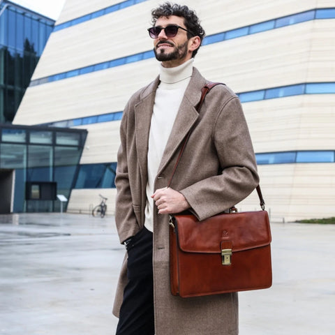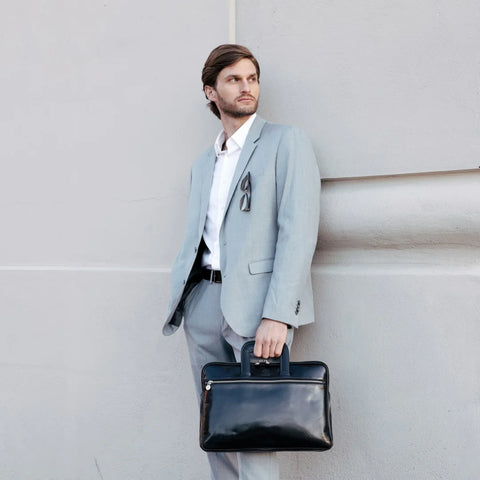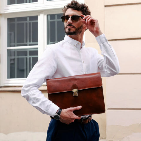 Šarm a elegance úspěšného podnikatele. Příjemný kontrast světla a moderní prvky dotvářejí business look našich kožených tašek.