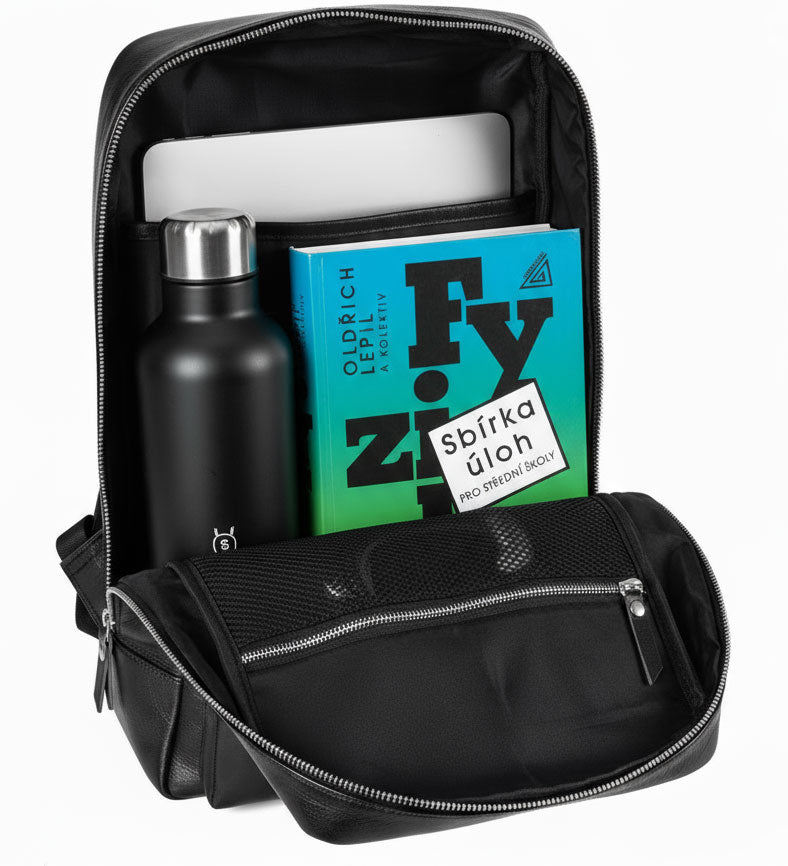 - samostatná síťovaná kapsa na zip - tam patří vše co potřebujete mít na očích, ale pečlivě uspořádané