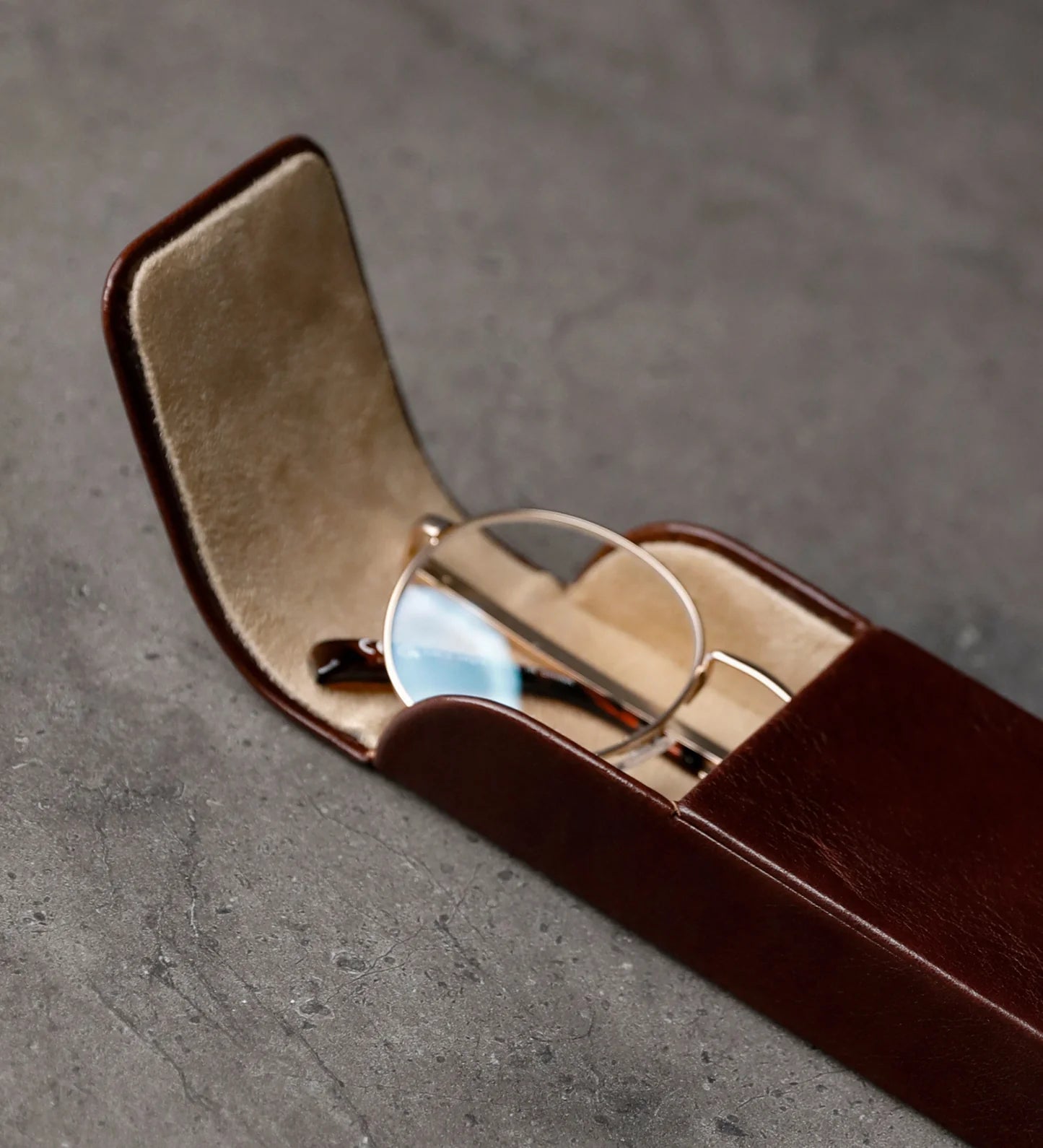 Vyrobeno s precizností z nejkvalitnější italské kůže, toto pouzdro je důkazem naší oddanosti kvalitě a tradici. Minimalistický design s čistými liniemi a magnetickým zapínáním poskytuje snadný přístup a zároveň zajišťuje bezpečné uložení vašich brýlí. Kůže, ručně barvená technikou rostlinného činění, získává s věkem přirozenou patinu, která dodává charakter. Měkká vnitřní podšívka chrání vaše brýle před poškrábáním a pevná konstrukce zajišťuje jejich ochranu před nárazy. Na přední klopě je jemně vyraženo naše logo – symbol řemeslné kvality. Spojení stylu a praktičnosti, které pozvedne váš každodenní zážitek.