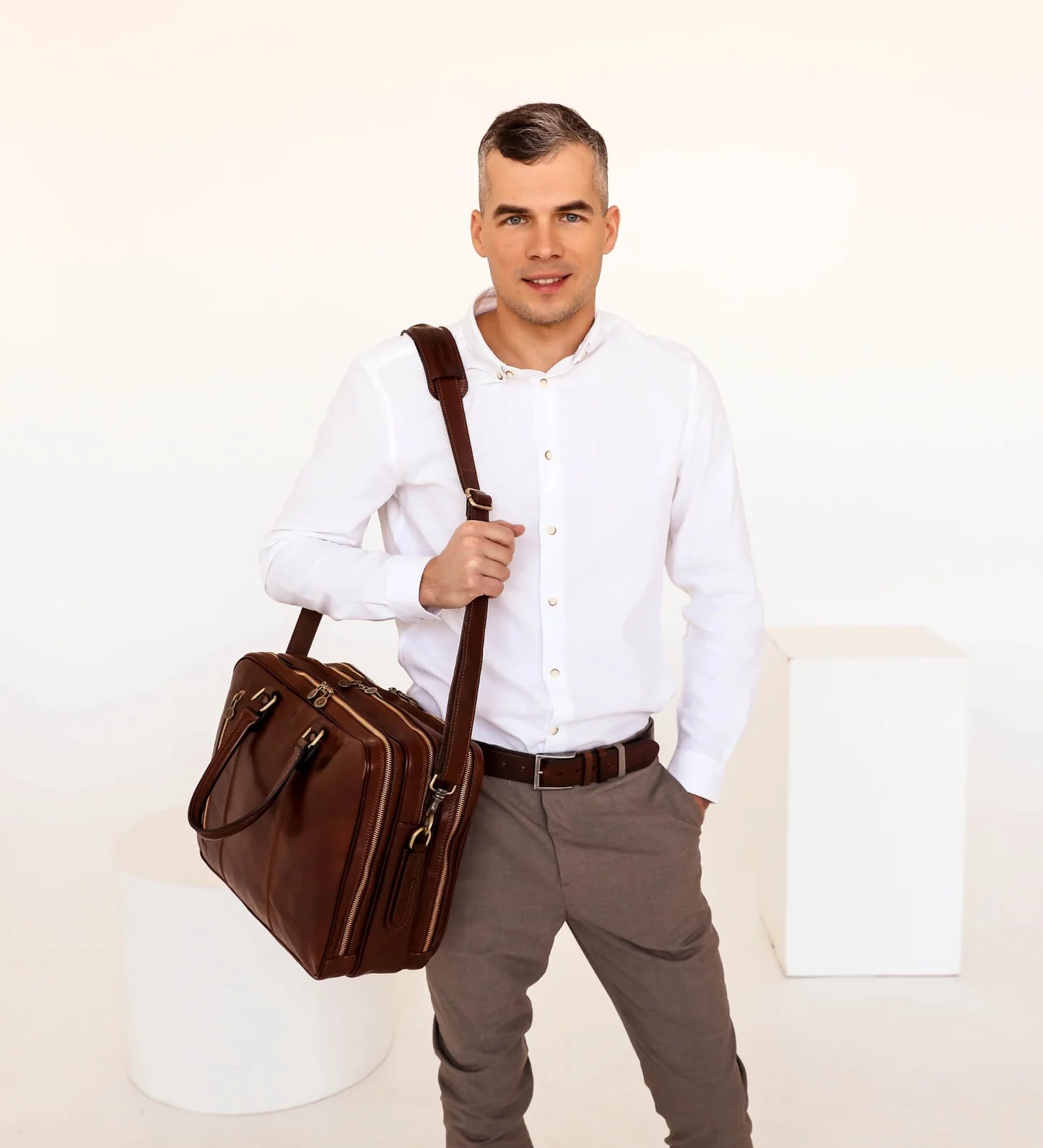 Tato prostorná kožená aktovka je ideálním společníkem pro ženy i muže, kteří potřebují přenášet více než jen pár drobností. Vyrobená z italské kůže nejvyšší kvality, nabízí tři hlavní oddíly a množství kapes, které vám umožní perfektně uspořádat všechny vaše nezbytnosti. Aktovku můžete nosit v ruce, přes rameno, proměnit ji na batoh, nebo využít popruh pro připevnění na kufr – její flexibilita vám poskytne maximální pohodlí na cestách.