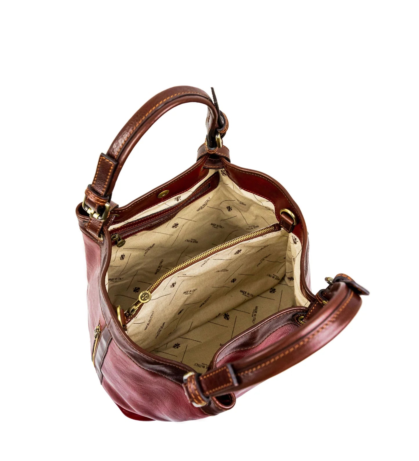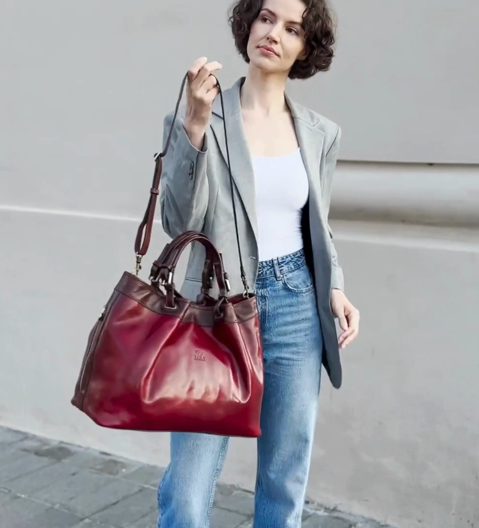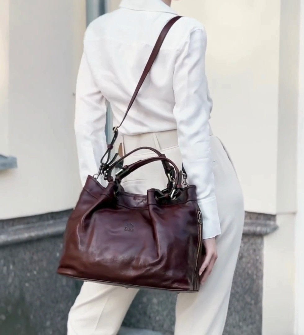 Představujeme kabelku "The Betrothed" – luxusní ztělesnění italského umění a prémiové kvality. Vyrobená z prvotřídní full-grain kůže, inspirovaná vlnami Jadranského moře, je věnovaná ženám s nezaměnitelným šarmem a sebevědomím, které se nespokojí s průměrem. S dvěma prostornými přihrádkami oddělenými zipovou kapsou poskytuje dostatek prostoru pro všechny vaše nezbytnosti. Navíc jsou zde dvě vnější kapsy na zip pro snadný přístup během vašich cest. Kabelka má odnímatelný, nastavitelný ramenní popruh, a dvě ucha pro pohodlné nošení v ruce či na rameni. Extra silný magnetický uzávěr zajišťuje bezpečnost, zatímco kovové cvoky chrání spodní část kabelky před poškozením. Spolehlivé kování a luxusní provedení dělají z "The Betrothed" skutečnou královnu mezi kabelkami.