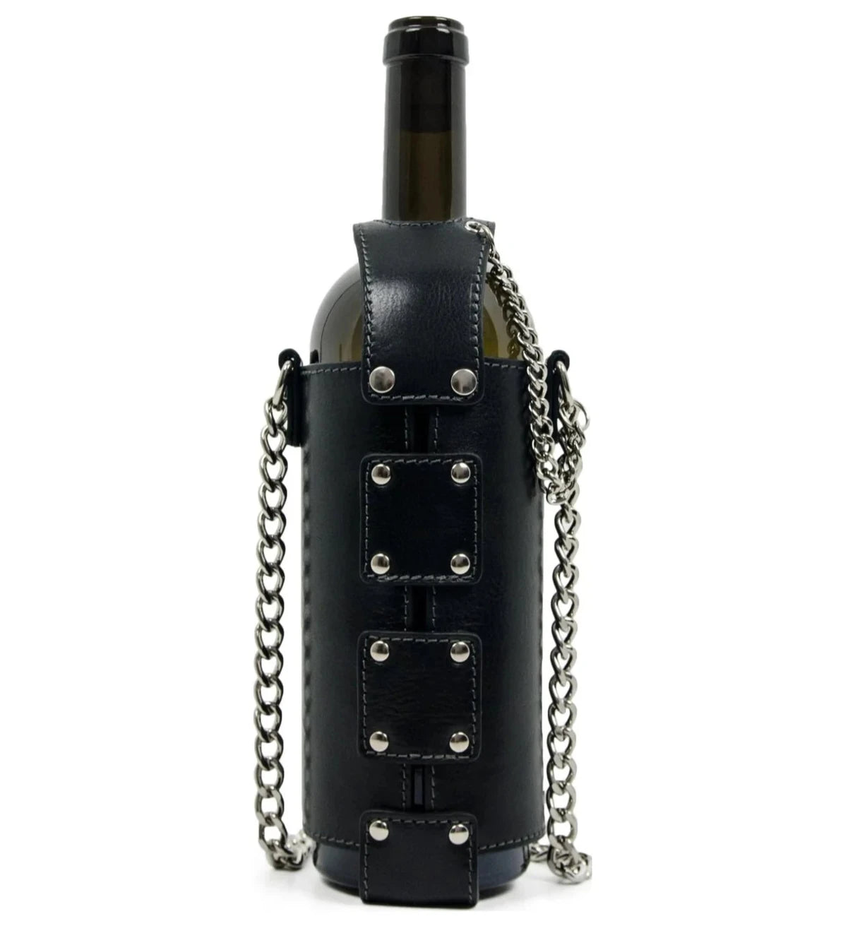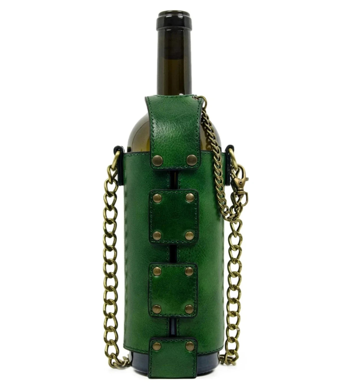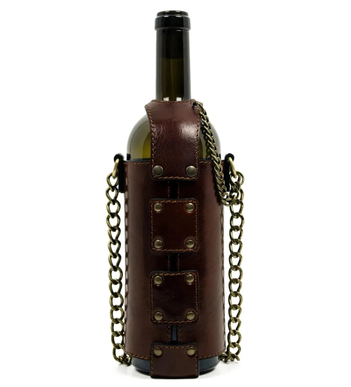 Tento elegantní nosič na láhev vína z kvalitní italské kůže je ideální pro bezpečný a stylový transport vína na jakoukoli oslavu – ať už jde o piknik v parku, domácí setkání nebo svatební hostinu. Kožené pouzdro je vhodné pro všechny typy lahví vína a je vybaveno bezpečným zapínáním pro snadný přístup. Díky ramennímu popruhu z řetízku jej pohodlně přenesete na rameni. Kvalitní kovové prvky dodávají tomuto kousku osobitý dotek, což z něj činí perfektní dárek. Kožené pouzdro pro luxusní italské nebo francouzské víno.