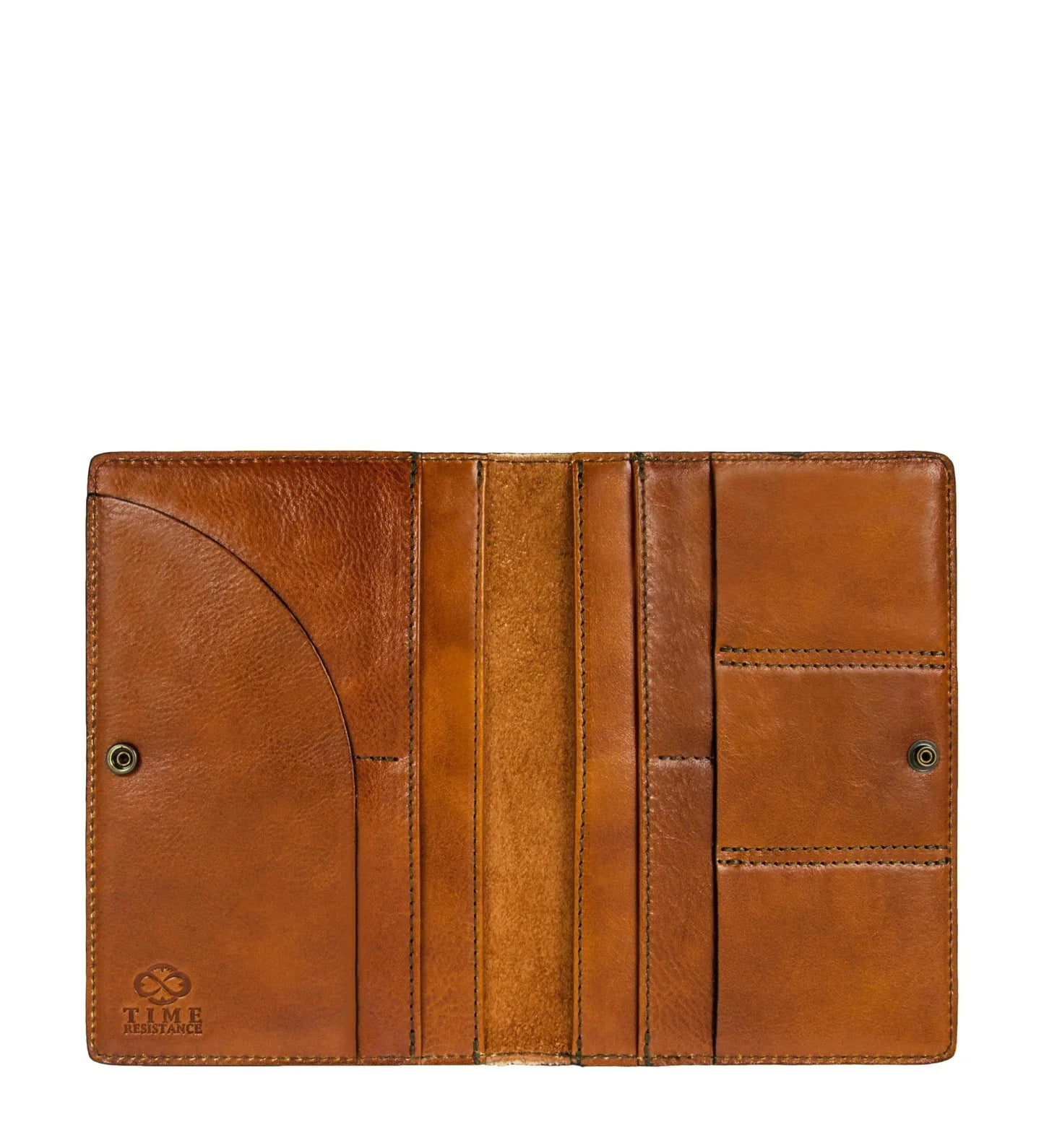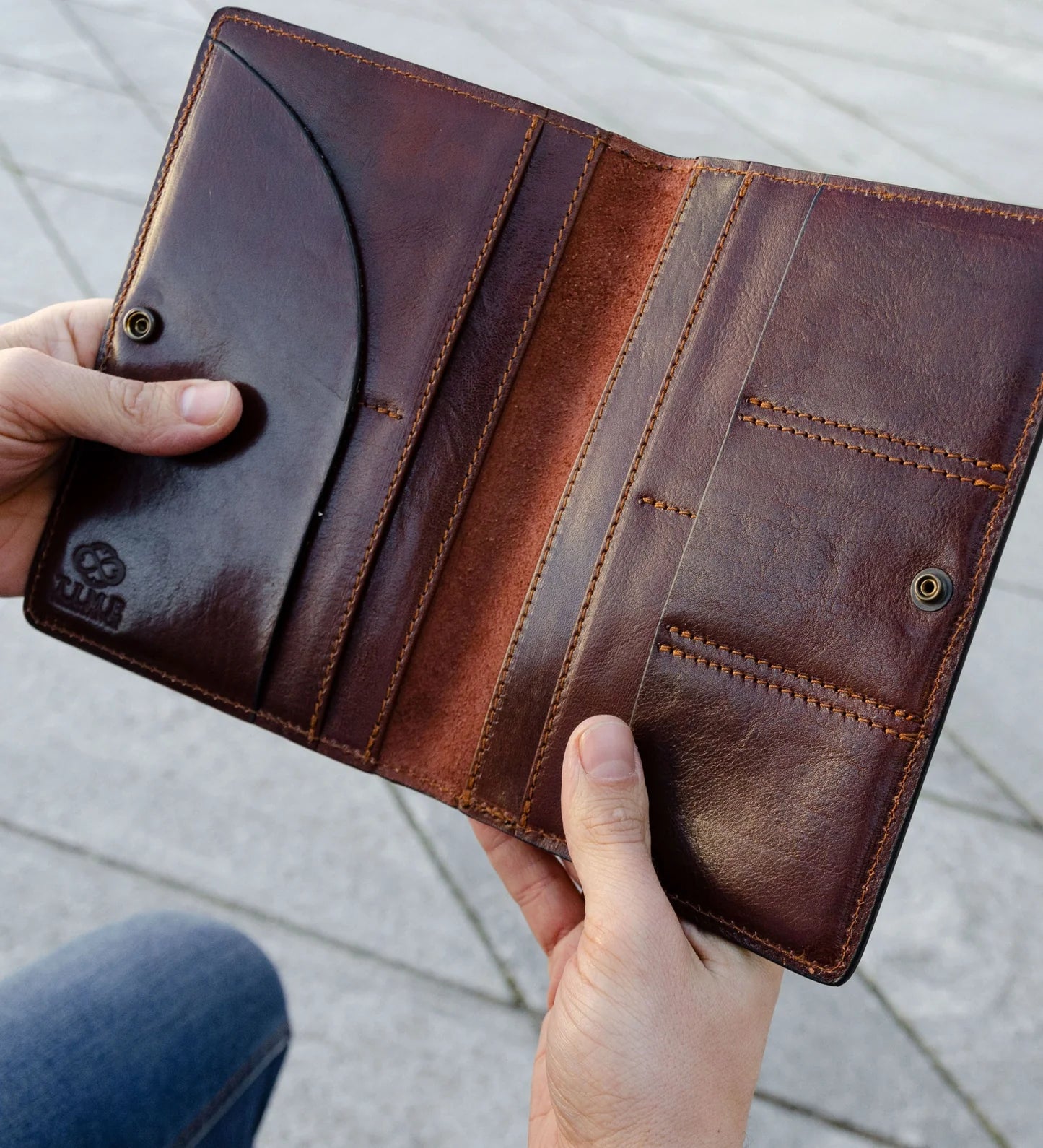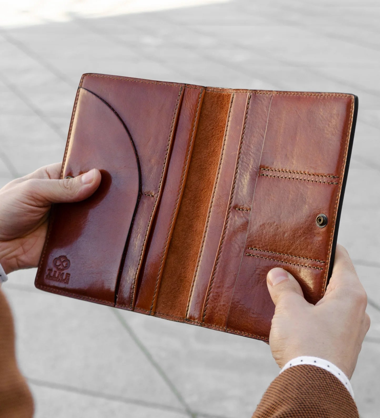 Toto elegantní rodinné pouzdro na cestovní doklady z prvotřídní kůže je ideální pro rodinné cestování. Umožňuje snadno uložit až čtyři pasy na jednom místě a nabízí dostatek prostoru i pro cestovní plány, letenky a další důležité dokumenty. Tři sloty na karty pojmou 3–6 karet, zatímco dvě velké vnitřní kapsy a praktická přihrádka na palubní lístky do letadla zajišťují maximální přehlednost. Díky zapínání na patent a spolehlivým kovovým prvkům je pouzdro nejen funkční, ale i odolné. Krásný dárek pro každého cestovatele.
