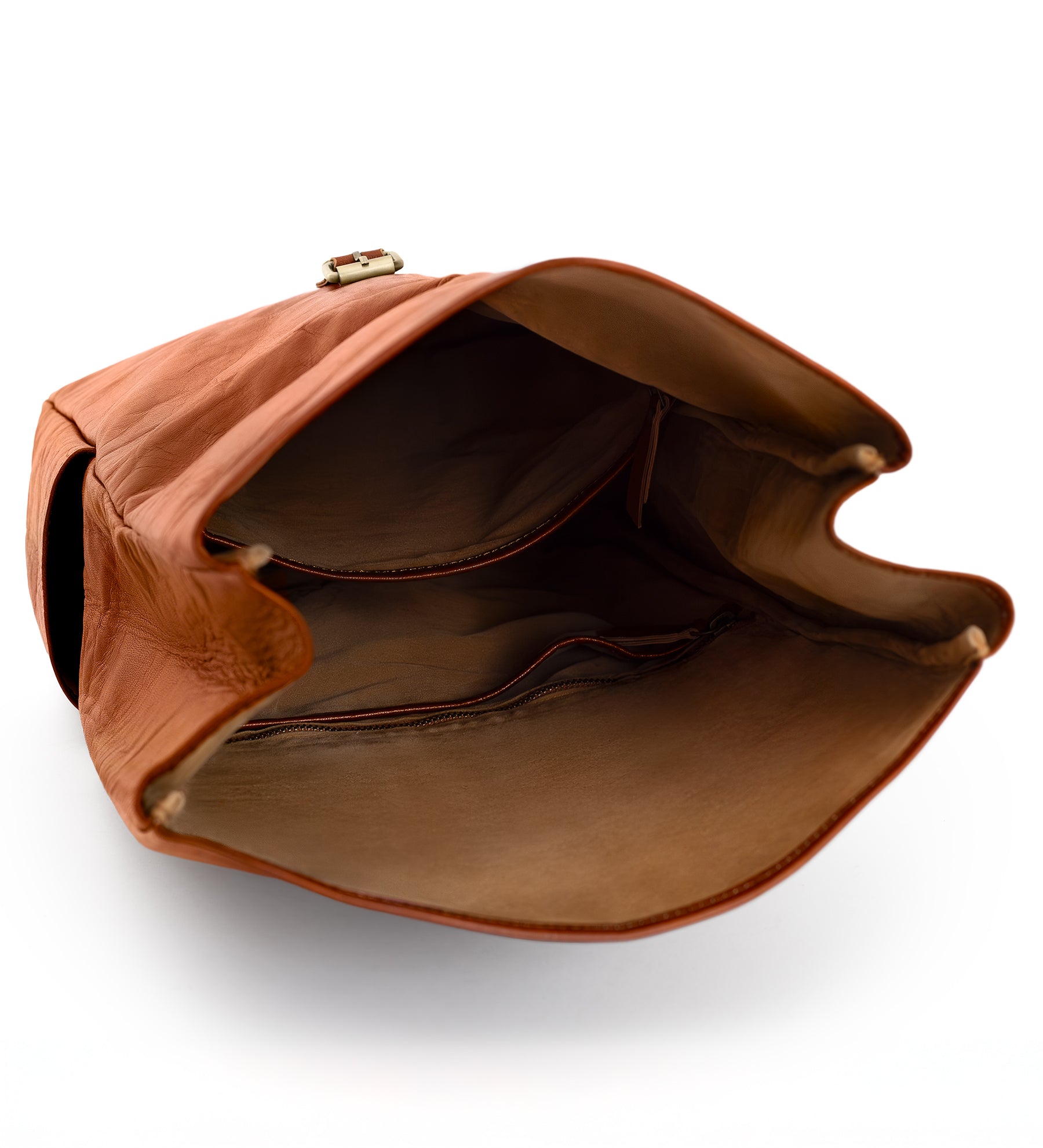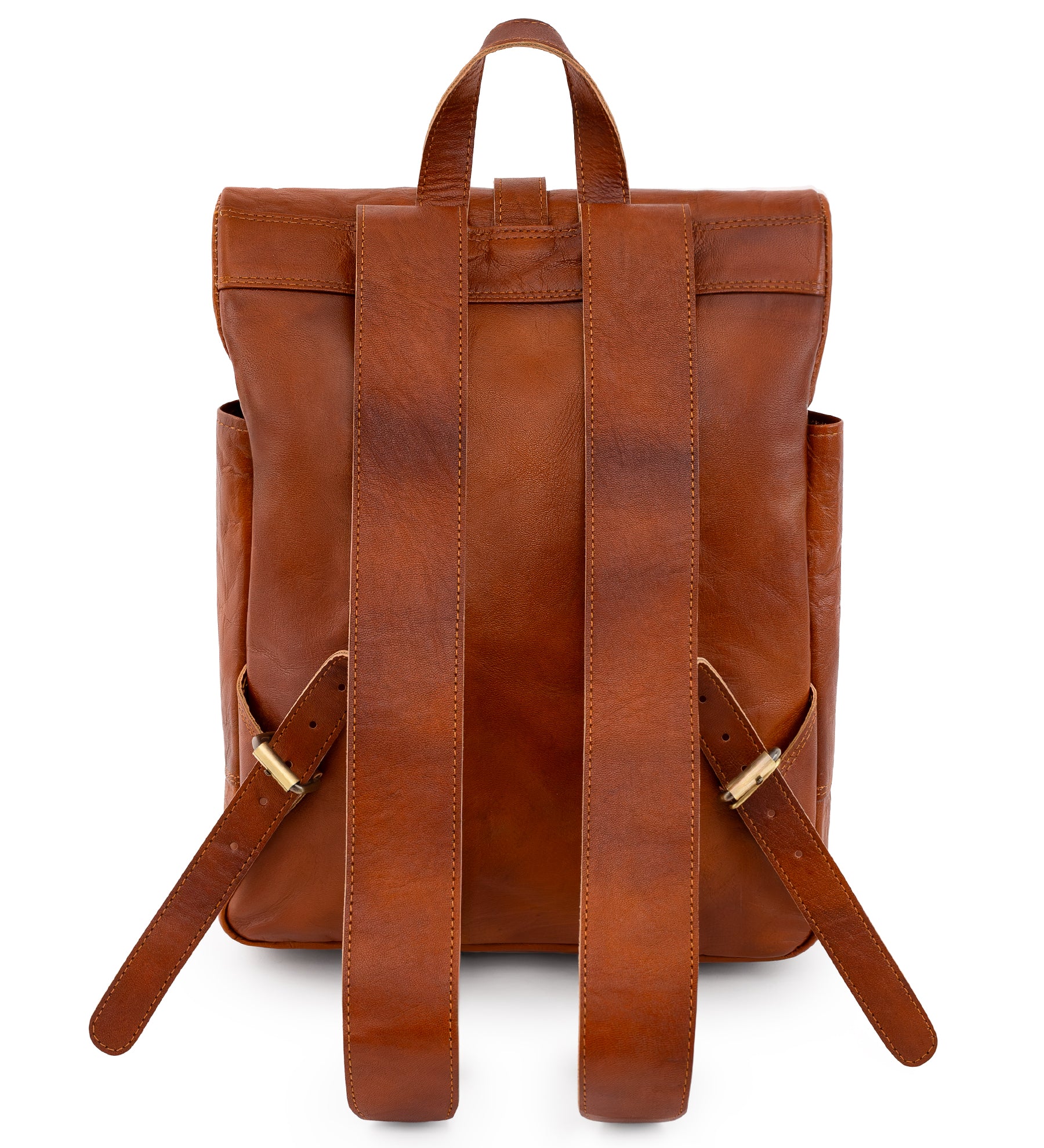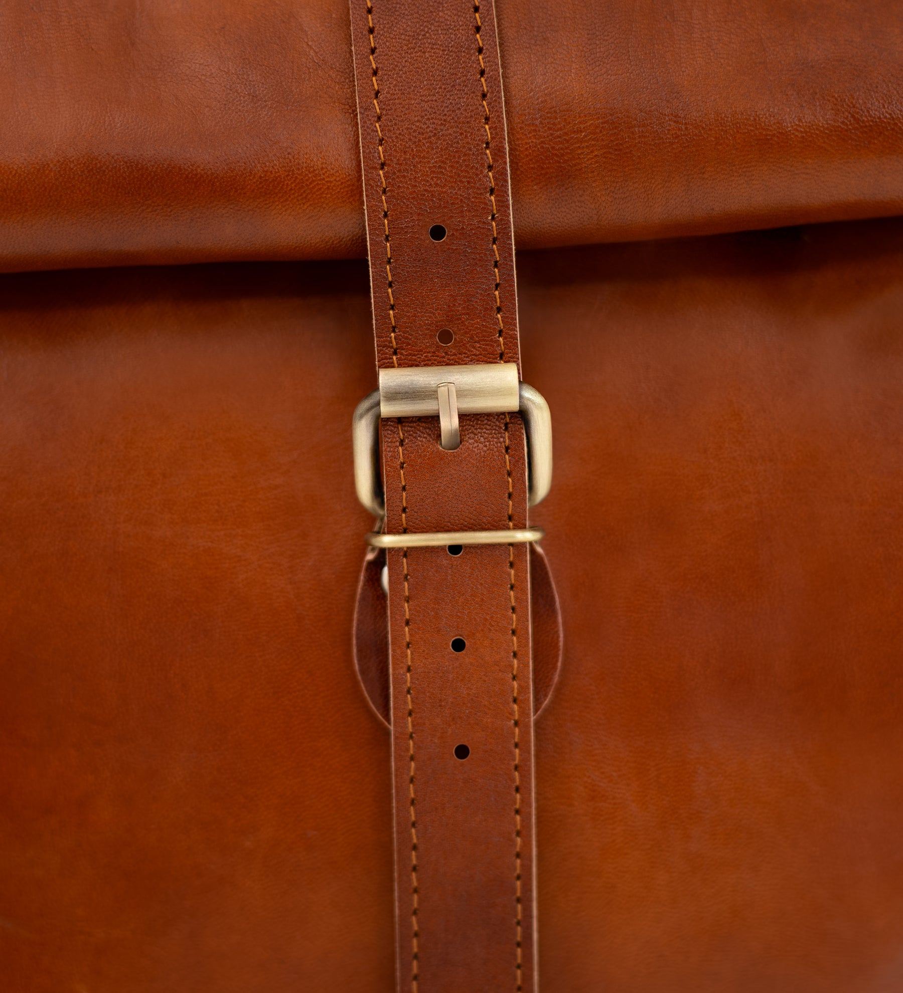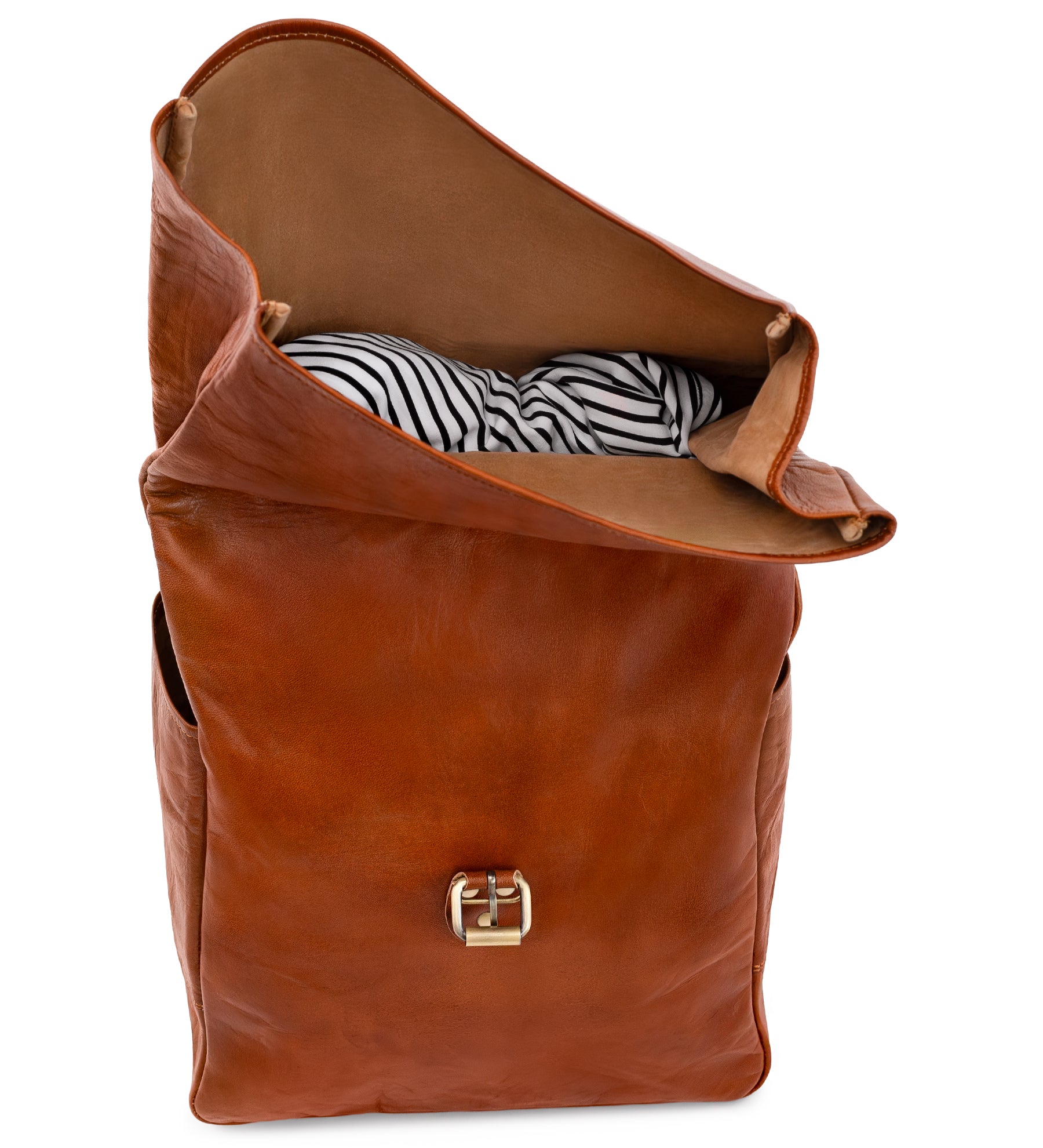 Rolovací kožený batoh v dokonalém čistém designu. Z boku má batoh 2 zásuvné kapsy - na brýle či deštník. Univerzální velikost vhodná do školy, práce i do města. Horní část batohu lze srolovat a zajistit koženým páskem s klasickou retro přezkou. Pokud rolování není váš styl, můžete horní část pouze přehnout a opět zafixovat koženým páskem. Batoh má pevné poutko pro nošení v ruce, nastavitelné popruhy a nízkou hmotnost (1 kg) pro pohodlné nošení na zádech i celý den.